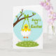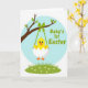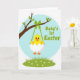 This design shows a bright yellow baby bird peeking out of cracked white eggshell pieces, its wide eyes and tiny smile giving it a sweet, friendly look. It hangs from a leafy tree branch by a green ribbon, like a small gift being offered with gentle care 🌷. Behind the bird, a soft sky-blue circle sets a calm spring backdrop, keeping the focus on the little character. Along the bottom, a band of green grass is dotted with small white flowers that feel like quiet company around the scene. The colors stay sunny and fresh—yellow, green, and blue—with simple shapes and clear outlines that keep everything easy to read. A short greeting appears below the illustration in rounded green letters, centered and spaced neatly so it stands out without crowding the art 🐰. The branch curves across the upper area with a few scattered green leaves, and the ribbon drops straight down to the chick and shell.