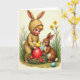 Designed with a soft, painterly spring scene, the front shows a small child in a beige bunny-style suit kneeling in the grass, long ears and a fluffy tail adding a gentle, friendly look 🐰. Beside the child, a small brown-furred woodland animal sits close, their faces angled toward each other as if sharing a quiet, affectionate discovery. In front of them rests a rustic nest made of green sprigs with tiny red blossoms tucked through it, set low among the blades of grass. Nestled inside is an oversized glossy red egg, and a tiny sun-yellow chick balances on top, drawing both characters’ wide-eyed attention. The background is filled with fresh greens, slender stems, and scattered yellow flowers that soften the scene like early morning light 🌷. A short Easter greeting appears near the top in a light sky-blue color, with smaller matching words placed neatly near the lower edge. In the foreground, a single smooth sky-blue egg sits among the green grass, catching a pale highlight along its curved side.