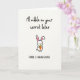 This card features a mostly white background that frames a cheeky, friendly scene with a little romance tucked into the joke 🌷. Near the top, casual black lettering reads, “I’ll nibble on your carrot later,” giving the message a teasing tone like a flirty note between close friends. Centered below, a small white bunny with long ears is drawn with simple black outlines, soft pink inside the ears, and tiny dot eyes that make it look sweet and innocent 🐰. The bunny holds an orange carrot with leafy green tops, angled slightly upward as if it’s being offered to someone just out of view. Under the illustration, a second line of black text appears in the same style, switching to all caps for emphasis: “SORRY, I MEAN EASTER.” The contrast between the innocent bunny and the self-correcting line adds a knowing, affectionate wink, like two people sharing an inside joke. The overall colors stay minimal—white, black, orange, green, and pink—while the bunny sits centered between the two lines of text. The carrot’s bright orange body and green leaves stand out against the white space beneath the top line of black lettering.