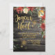 Um feriado elegante e elegante convida com um novo fundo de conselho rústico de madeira com buquês florais vermelhos de feriado e verde everdeado com caligrafia de ouro brilhante e um borrão de flocos de neve delicados, iluminados por uma lanterna, desejando aos seus destinatários um Noel Joyeux em francês e uma feliz temporada de férias. Este cartão está em francês.