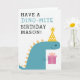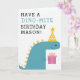Cartão de aniversário azul engraçado e giro Dinossauro com um dinossauro azul vestindo um chapéu de festa e um presente de carregando. O texto diz "Tenha um aniversário DINO-MITE" Você pode adicionar o nome do aniversariante por baixo. O texto é facilmente editável on-line.
