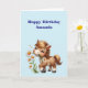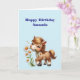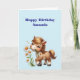 Cartão de aniversário com uma ilustração adorável. Um pequeno pônei marrom comendo margaridas felizes.