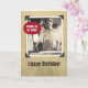 Vintage, foto de uma mulher passando roupa. Ela está dizendo, "As rugas se vão!" enquanto ela está sorrindo e passando roupa. O dentro diz: "Que você tenha um aniversário sem rugas!"