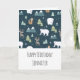 Cartão de aniversário com um padrão rústico. Ursos polares, renas, árvores. raposas e flocos de neve. Num fundo verde escuro.
