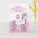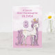 Um doce pônei rosa como sua bisneta está saltitando com o número oito! Detalhes com aparência dourada estão entrelaçados em sua crina e cauda. Cartão perfeito para desejar feliz aniversário de 8 anos à sua bisneta! Personalize este cartão com o nome da sua bisneta.