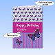 Um design de cartão de aniversário moderno que você pode personalizar com seu próprio texto e o nome do destinatário. O esquema de cores é rosa, lilás e azul, e há borboletas coordenadas e padrões de listras na frente. Digite as caixas para alterar a saudação na frente "Parabéns" e o nome. E mude a mensagem dentro, ou use o "Desejo que você ame e felicidade no ano que vem".