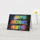 Este design de cartões de aniversário divertidos, vibrantes e multicoloridos apresenta a mensagem "FELIZ ANIVERSÁRIO" e o nome comum "SAWYER" com as letras que têm um espectro colorido de arco-íris, como um padrão de coloração gradiente. O fundo da frente também apresenta um padrão colorido inspirado pela aparência de fogos de artifício comemorativos em explosão. O dentro apresenta uma mensagem de saudação personalizável, ou talvez possa ser apagado e deixado o vazio se uma mensagem for escrita manualmente. Um cartão de saudação como este pode ser uma maneira divertida de reconhecer o aniversário de alguém chamado Sawyer. [~Z0000350]
