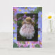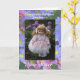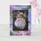Parabéns você tem um novo texto da irmã no cartão floral lilac com boneca bonito em vestido lilás na cena do jardim com fundo floral