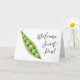 Cartão de saudação para parabéns de bebês bonitos com uma ilustração desenhada à mão de uma ervilha verde com rostos bonitos. O texto diz: "Bem-vindo, doce ervilha!"