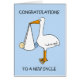 Uma gigante cegonha de desenho animado prende um bebê em uma folha que pende do bico da cegonha. A imagem tem um fundo azul pastel.