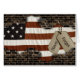 Dog tags militares na bandeira atrás do muro de tijolos.