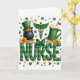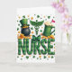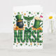 This greeting card features a white background with scattered green three-leaf clovers and small gold coins that look like they’re drifting through the air ☘️. Centered in the upper half, a green medical caduceus stands tall, giving the scene a caring, supportive feel that reads like a quiet nod between friends. To one side sits a black pot filled with shiny gold coins, topped with a green leprechaun hat, and nearby a green tankard spills over with frothy white foam and a tiny red flag detail. A small green bow sits just below the central icons, visually tying the top illustration to the lettering beneath it. Across the lower third, the word “NURSE” is placed large and wide in a raised, three-dimensional plaid pattern made from several shades of green 💚. The lighting is soft and gentle, adding depth to the hat brim, the coin edges, and the foam’s rounded texture. Little clovers and coins are sprinkled around the main objects, leaving plenty of open white space for a crisp, airy look.