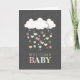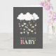 Um cartão de chá de fraldas com ilustração de corações em várias cores penduradas em nuvens. O fundo é cinza. Os convites para chuveiros de bebês combinam com os pontos de coordenação estão disponíveis na Paperie de Jill.