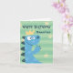 Um cartão de aniversário bonito com um tema do dinossauro, características deste design um grande dinossauro azul de T-Rex que veste uma coroa do aniversário. Um fundo de listras verdes e confetes e estrelas amarelos adiciona a cor e o divertimento ao design. Personalize com nome da sua criança. O texto interno pode igualmente ser personalizado com seu fraseio desejado.