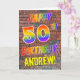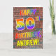 A parte dianteira destas características de design aniversário-temáticos atraente, da excitação e do divertimento do cartão a mensagem "50TH ANIVERSÁRIO FELIZ" com as letras que têm um arco-íris colorido gosta do teste padrão do inclinação, e um nome editável coloriu o amarelo, em um fundo do teste padrão da parede de tijolo. O olhar é inspirado por aquele da arte dos grafites ou da rua tirada na parede. As características internas uma mensagem do cumprimento do aniversário que possa ser personalizada. Um feliz, divertimento, cartão personalizado do aniversário como este pôde ser usado para enviar uma mensagem do cumprimento do aniversário a alguém que está comemorando seu fiftieth aniversário. [~Z0000357]