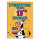 " Eu "reuno-o" era seu 13o aniversário!" vaca de b-dia do divertimento que guardara um cartão do bolo de aniversário.