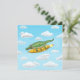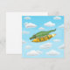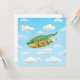 O crocodilo verde voa alto no céu usando seu foguete de ouro rápido.