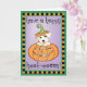 Envie cumprimentos do Dia das Bruxas com este cartão de um filhote de cachorro bonito de Bichon Frise em uma Jack-o-Lanterna de sorriso. Excelente para miúdos de todas as idades que amam lebreiros e Dia das Bruxas. Tenha um Uivo-oween feliz!