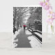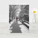 Sob a cobertura de um guarda-chuva vermelho, uma mulher anda com o cachorro no inverno, nevando. Este cartão de saudação é totalmente personalizável e pronto para ser personalizado.