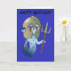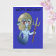 Um de mermen do guerreiro de Netuno. Está vestindo um capacete e tem um tridente. O interior do cartão lê: Feliz aniversario.