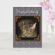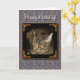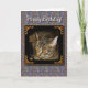 Gato de gato malhado novo bonito da cavala com os olhos ambarinos dourados. "Os olhos dourados" FASCINÁ-LO-ÃO com seus encantos do gatinho! Fundo colorido de paisley das características e "feliz aniversario!" "