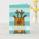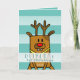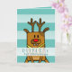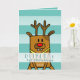 O primeiro cartão de Natal do Bebê de Turquesa de Veado Bonito. Veado bonito sobre fundo turquesa com listras. Personalize o cartão com o nome do seu bebê e o ano de nascimento.