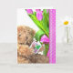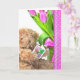 Urso de pelúcia com buquê de tulipas e bolinhas e lugar para o Aniversário da Avó.