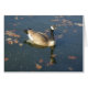 Este Canadá ganha natações através de água cheia de folhas de carvalho do outono. Um reflexo aparece na água abaixo.