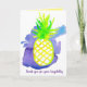 Um obrigado para sua hospitalidade com um abacaxi amarelo brilhante com folhas primavera verde em uma poça roxa de tinta aquosa em um design de estilo minimalista. No dentro apresenta uma cor amarela quente e outro abacaxi em tons de aquarela verde e azul. O abacaxi é um símbolo de hospitalidade há muito tempo. Um exemplo é que, quando pessoas viajavam para o Caribe, os nativos penduravam a fruta em entradas como sinal de boas-vindas aos visitantes. Você pode editar o texto, a cor do dentro e a posição do abacaxi do dentro para ajustado das suas necessidades.