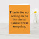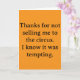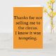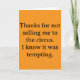 Obrigado por não me vender para o circo. Eu sei que foi uma carta tentadora