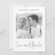 Clássico Amor Negro e Branco e Obrigados Foto de Casamento Obrigado. Um roteiro de estilo manuscrito para Amor e Obrigados e o resto do texto na frente e no verso você pode facilmente personalizar com seus nomes, data de casamento e mensagem. Adicione sua foto favorita de vocês dois do dia do seu casamento simplesmente substituindo a imagem de amostra. Ele se converterá automaticamente em preto e branco à medida que tem um filtro aplicado. Para remover ou adicionar um filtro diferente, clique no botão Editar mais na parte inferior da caixa Personalização, clique em filtrar na parte superior direita e escolha Sem filtro para ter a foto na cor original ou em outro filtro da sua escolha.