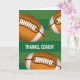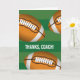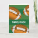 Diga obrigados a um treinador especial com este design de futebol ousado, com bolas de futebol marrons contra um campo verde listrado. Perfeito por mostrar apreço no final da temporada, depois de um grande jogo, ou a qualquer hora que você quiser reconhecer a dedicação e o encorajamento de um treinador que inspira a equipe.