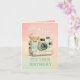 Este cartão de aniversário divertido apresenta uma câmera vintage caprichosa com um flash de cupcake. O fundo tem uma mistura pastel formada. A dentro do cartão apresenta outra câmera com cupcakes e uma saudação que diz "desejando uma foto perfeita de aniversário".