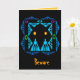Este cartão de Dia das Bruxas apresenta uma face assustadora com olhos brilhantes de ouro rodeados por um padrão geométrico quadrado de ornamentado em tons de azul com acentos de verde e rosa. É colocado sobre um fundo negro para um efeito dramático. O texto diz: Cuidado. Fique fora da floresta no Halloween. Ele pode ser personalizado para atender às suas necessidades.