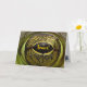 Esta assustadora carta de Halloween apresenta um fechamento de um olho de sapo verde. Sua íris é um incrível padrão abstrato de ouro e amarelo. O aluno preto puro e oval no centro reflete árvores a distância.Mais sapo estão espreitando dentro. Todo texto pode ser personalizado ou removido.