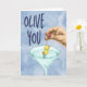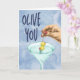 Este cartão apresenta um retrato aquoso da mão de uma mulher, agitando um martini sujo com a legenda "azeitona você".