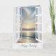 Vista de uma cena oceânica com nascer do sol, nuvens e areia de praia através de uma janela branca aberta com cortinas estreitas. Todo texto é editável.