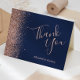 Este cartão de agradecimento de casamento moderno e elegante apresenta uma borda de brilho falso de ouro rosa em um fundo azul marinho. O texto personalizável combina as palavras "Obrigado" em letra cursiva rosa e os nomes da noiva e do noivo em fonte itálica.