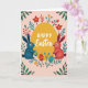 This card features a warm golden-yellow oval at the center with a celebratory message in flowing lettering, set to stand out clearly against the background. On the left, a long-eared blue bunny holds a patterned egg close, angled inward as if sharing a quiet, friendly moment with the scene. On the right, a long-eared coral-red bunny mirrors the pose, its gentle stance and inward gaze suggesting a sweet connection between the pair 🐰. Around them, leafy green shapes, small red blossoms, and tiny teal buds form a decorative border that feels like early spring 🌷. The background is a soft blush pink, keeping the focus on the central oval and the two animals. A few smaller patterned eggs sit near the lower area, some perched on thin stems, adding depth and detail without crowding the layout. The central message appears in a darker tone on the yellow oval, while the surrounding patterns use blues, reds, greens, and teals in tidy, flat shapes. Near the bottom, several geometric eggs rest among slender sprouting stems beneath the two bunnies.