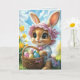 Coelhinho da Páscoa bonito vestindo seu melhor Primavera, chapéu rosa. Ela está segurando uma cesta cheia de Ovos de Páscoa coloridos. Ela se senta num jardim de bonito Daffodils amarelos sob um céu azul brilhante.