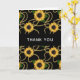 Cartões de agradecimentos com um padrão elegante e na moda. Bonito girassóis amarelos e folhas verdes cercadas por delicadas cadeias de ouro. Fundo preto.