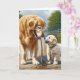 Um grande recuperador de ouros em uma coleira está olhando para um filhote menor procurando por pai de aniversário.