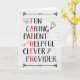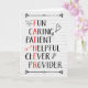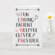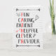 Cartão de aniversário para pai com palavras descritivas, incluindo diversão, carinho, paciente, útil, inteligente, provedor, com certas letras que soletram "PAI" A placa tem um fundo branco e coelho, coração, flecha e rabisco de lâmpada. Mude o dentro, se quiser.