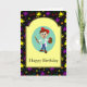Deseje a qualquer artista carinhoso um feliz aniversário com este cartão colorido. Um garoto artista vestindo uma boina vermelha e uma tinta branca espalhou-se. Um pincel em uma mão e uma paleta na outra. Um fundo preto coberto por um padrão de pinturas multicolores.