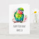 Cartão de aniversário com uma ilustração fofa de papagaio. Um pequeno papagaio verde com cores azuis e amarelas se misturando. O pescoço tem um tom vibrante de rosa avermelhado.