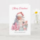No maravilhoso cartão de Natal, um velho Papai Noel e um pirata-prego ficam entre presentes envoltos em papel azul com árvores de Natal cor-de-rosa