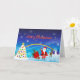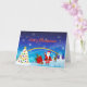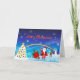 Bela paisagem nevada com uma árvore de Natal, flocos de neve e um arco-íris no céu. Papai Noel está acenando e duas renas estão penduradas juntas para distribuir presentes de Natal.