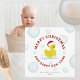 Ilustração de um pato de borracha amarelo que veste Santa, rodeado de bolhas. Personalize as costas com sua foto no verso.