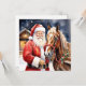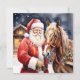 Um Papai noel vintage parado com um cavalo marrom em frente a um celeiro rústico numa noite de inverno nevada.
