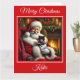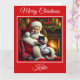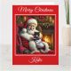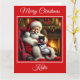 Uma bela cena de Natal com Papai Noel e um adorável gatinho preto e branco vestido para o Natal sentado ao lado de uma lareira quente. Ela inclui uma mensagem de Natal engraçada original que amantes de gatos certamente amam.